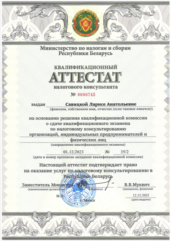 На сегодня являюсь аттестованным Министерством по налогам и сборам Республики Беларусь налоговым консультантом с правом оказания услуг в Республике Беларусь по налоговому консультированию организаций, индивидуальных предпринимателей и физических лиц.